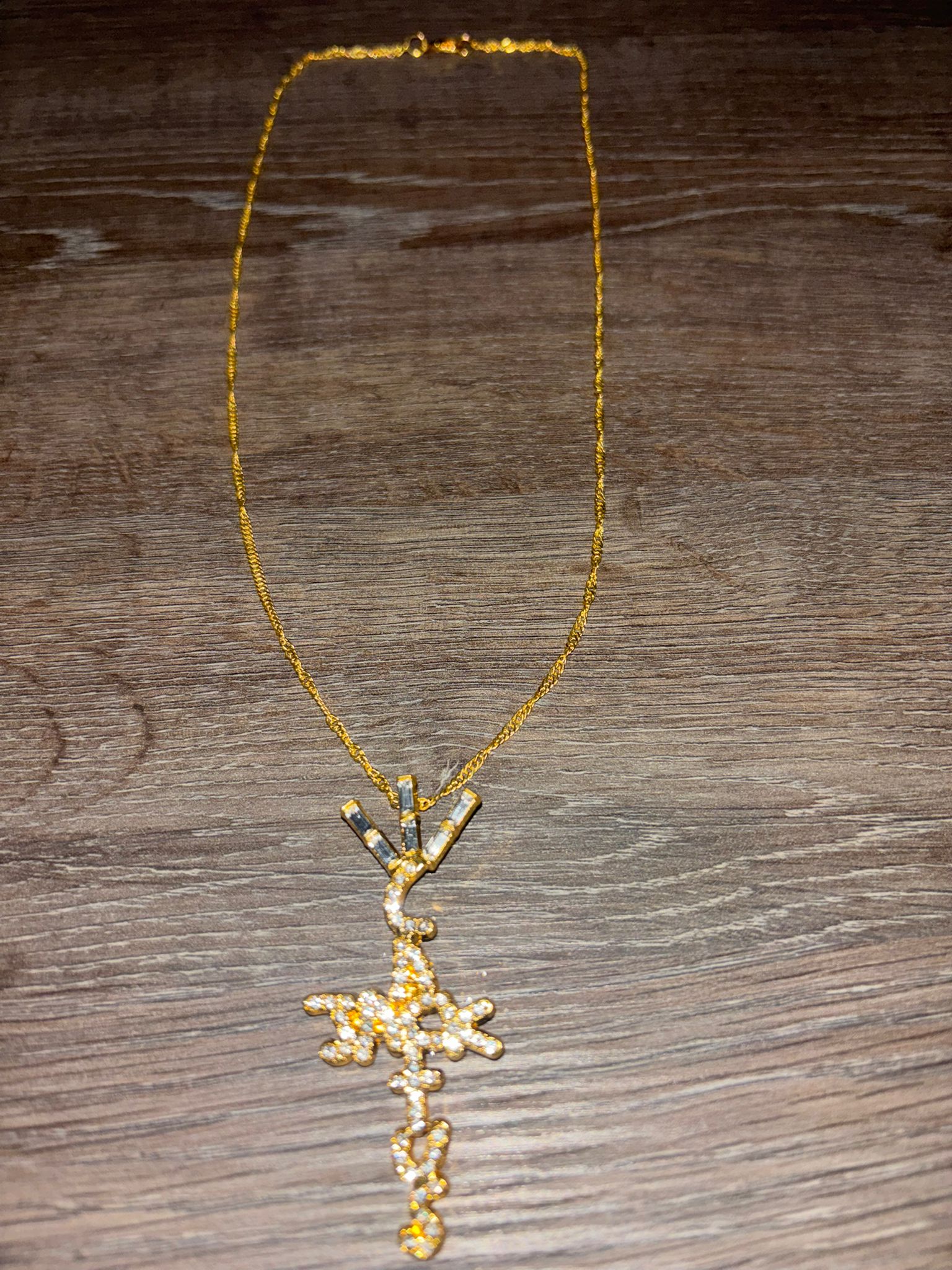 This statement necklace features a bold cross silhouette fused with flowing script lettering, fully iced with precision-set stones for maximum shine. The intricate design blends spiritual symbolism with modern street aesthetics, making it a standout piece for everyday wear or special occasions.